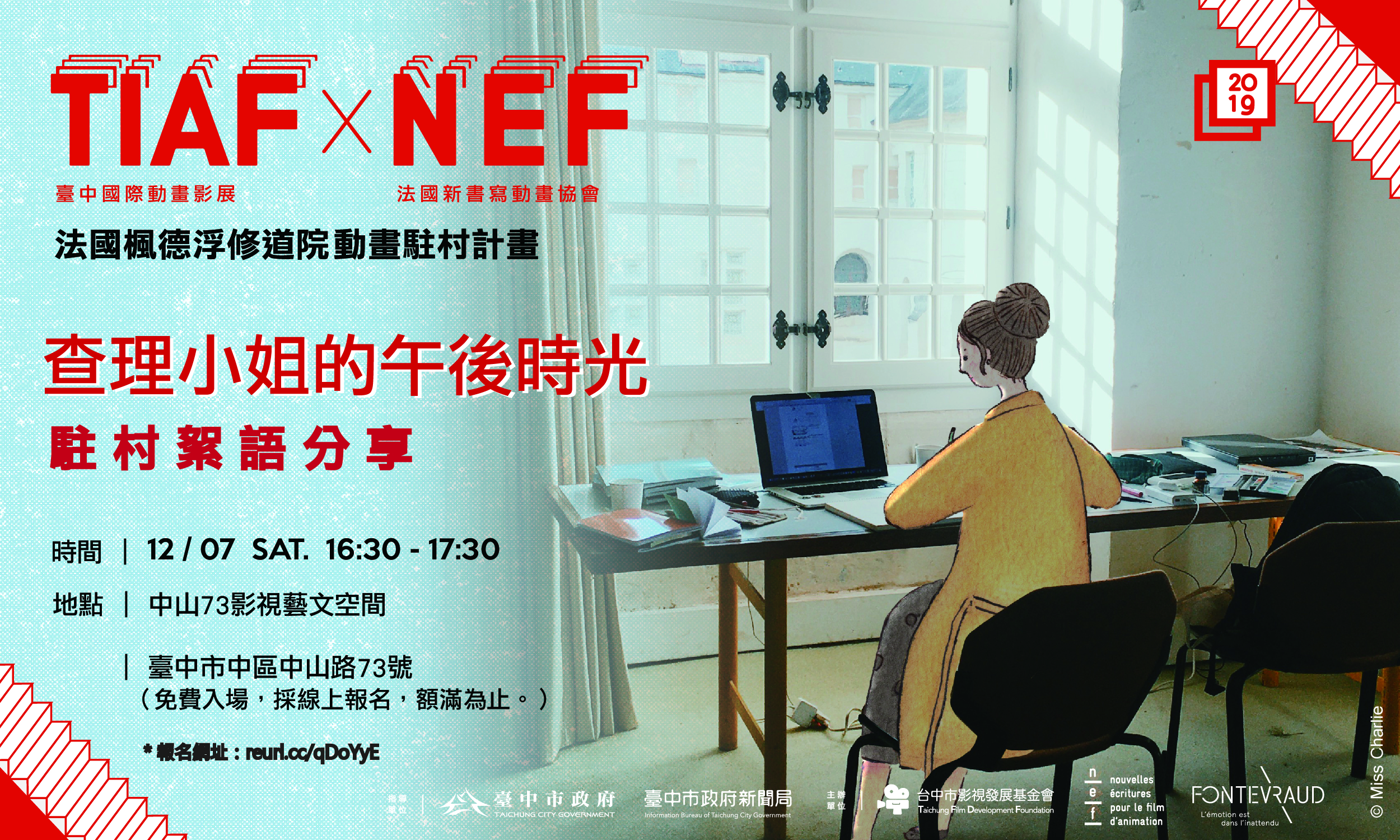 FB粉絲團 IG粉絲團 售票連結 Youtube 手冊下載 最新消息 2020-04-14 2020臺中國際動畫短片競賽徵件開跑 總獎金高達120萬 最新消息 2019-12-12 “駐村30天”9國交流 台灣導演獲國際合作邀請 最新消息 2019-10-21 2019 IAD 國際動畫日 最新消息 2019-10-21 2019台中國際動畫影展國際競賽頒獎典禮 公布得獎名單 最新消息 2019-10-11 176部各國精采電影放映 2019台中國際動畫影展正式開幕 最新消息 2019-10-08 台中國際動畫影展即將開跑 國際導演接力訪台與觀眾見面